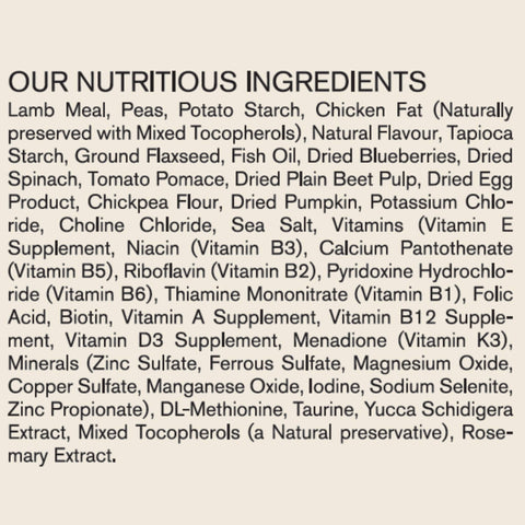 We've carefully selected each ingredient for its nutritional benefits. For example, our Australian pasture-raised lamb provides your cat with amino acids for healthy muscles and strong bones. Our sun-ripened peas are packed with vitamins, minerals, protein, fiber, and antioxidants to support healthy digestion and our ocean fish oil is rich in Omega fatty acids to promote healthy skin and coat.